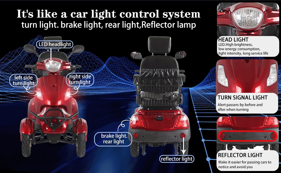 POWERFUL MOBILITY SCOOTER-Powered by a powerful yet quiet 600 Watt transaxle brushless electric motor & a 60V 20Ah long range extended battery, this 4 wheel mobility scooter can travel farther & faster than other scooters on the market. The front & rear electronic braking system ensure driving stability and steerability even when you need to stop suddenly. This high-performance scooter can hold up to 500 lbs.