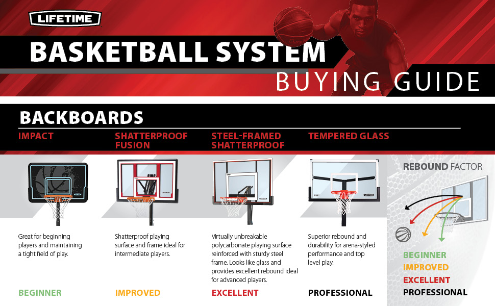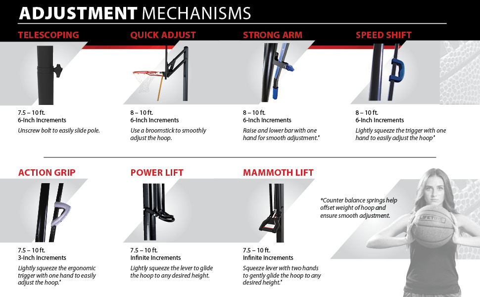 The basketball system comes with a 52-inch-square Shatter Guard backboard made of Makrolon polycarbonate, which is virtually unbreakable and several times stronger than acrylic. When combined with the heavy-duty steel frame and the sturdy steel Y-extension arms, the basketball goal looks and plays just like pro-style glass, with superior rebound effects and terrific stability. The system also includes a three-piece, 3.5-inch round pole with Lifetime's patented pneumatic Action Grip® height mechanism. To change the pole's height--it adjusts from 7.5 to 10 feet in infinite increments--simply activate the Power Lift with one hand and push it to the correct height. And Lifetime knows that dunking and above-the-rim play are a huge part of modern basketball, which is why the basketball goal includes a Slam-It rim. The solid-steel rim features double-compression springs that give way during dunks to protect the player, then spring back once released.