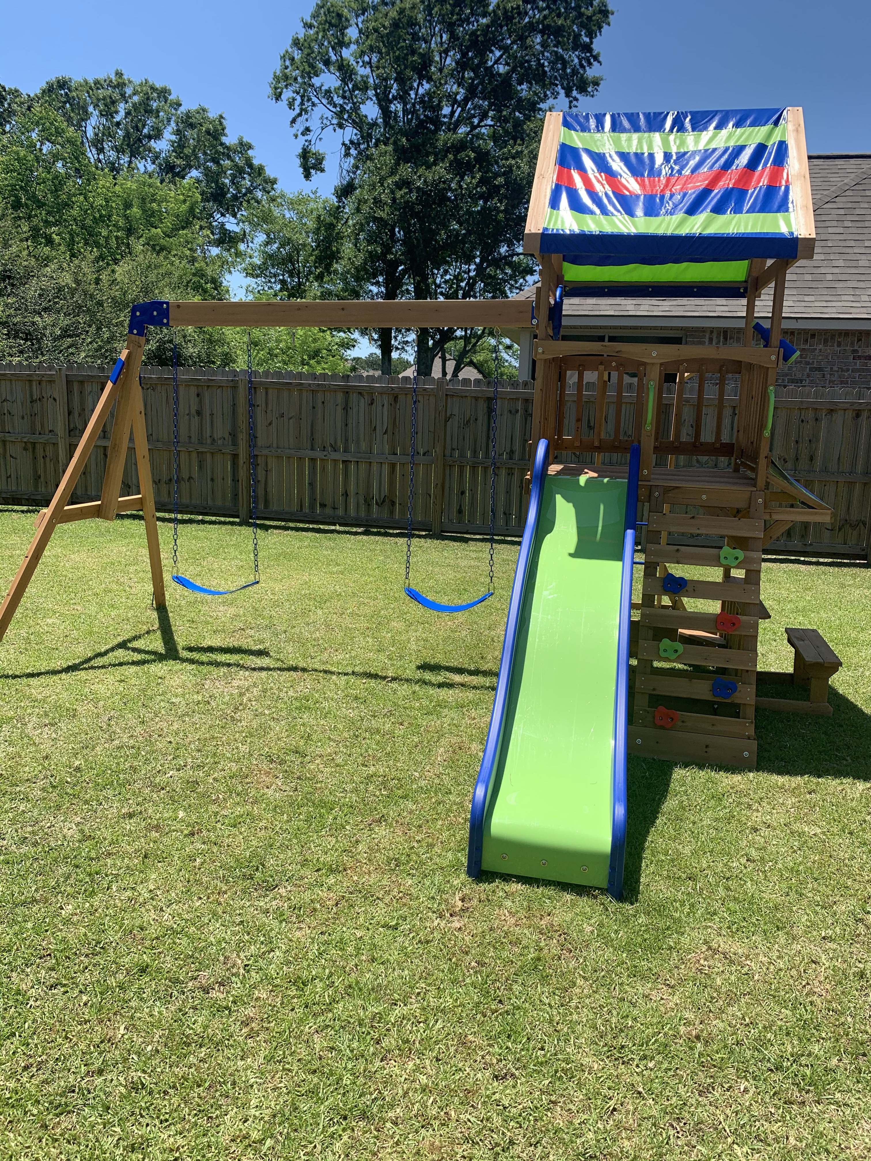 Love the play set but it was very overwhelming to put together. After opening the boxes, we decided to hire a handyman to put it up. It took the handyman, his wife and my husband 9 hours to put this set up. It was a lot of work but the end result is that my twins love it!